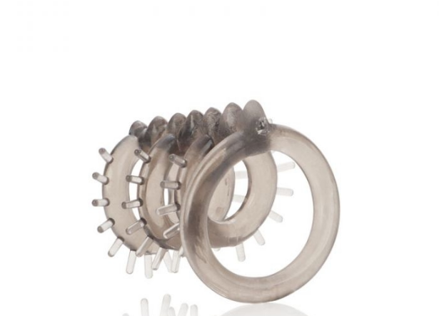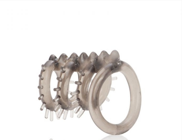 Насадка состоит с 3 эластичных колец, располагающихся вокруг члена и одного кольца диаметром побольше, которое надевается на мошонку.